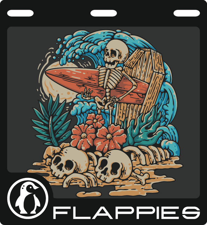 This quirky design features a skeleton stepping out of a coffin with a surfboard, set against a vibrant wave, skulls, and flowers. Perfect for surfers with a sense of humour and a love for unique art.